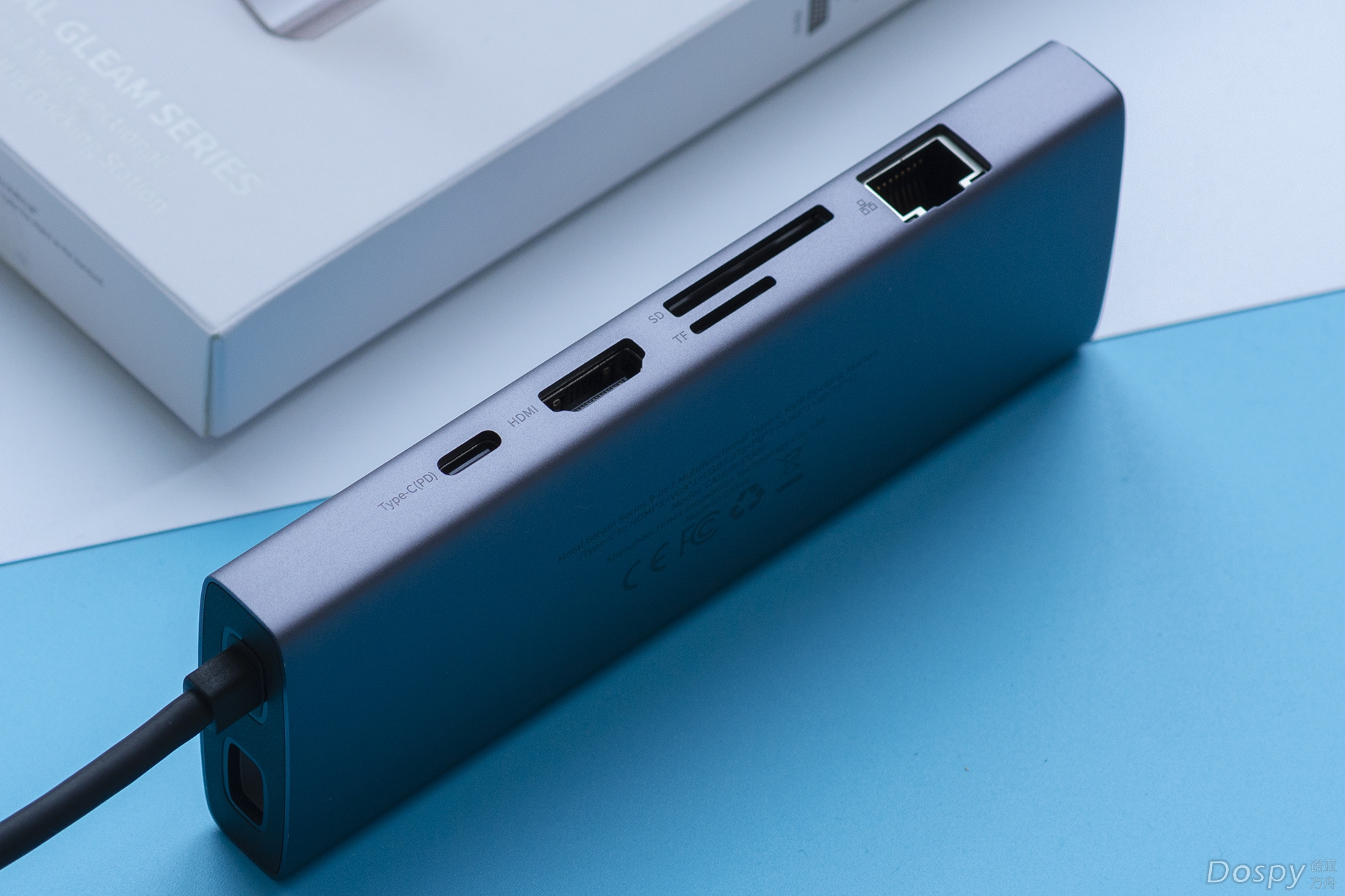 扩展坞右侧是3个USB3.0接口,支持5Gbps(Max),同时向下兼容USB2.0。左侧接口比较杂乱,依次是Type-C接口(最大支持100W),HDMI接口(支持4K@30Hz高清显示),SD/TF卡槽(支持SD2.0,支持同时读取),RJ45网线接口(最高支持1000Mbps)。