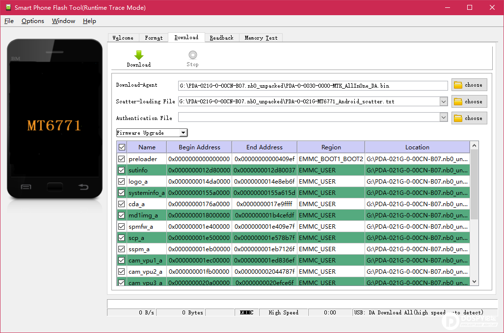 我之后整理基带丢失后的恢复教程的时候会用到这个备份的。 首先,下载国际版固件“PDA-1100-0-00WW-B01_unpacked.7z”并解压。 在联发科刷机工具的Download栏目选好国际版固件附带的PDA-0-0030-0000-MTK_AllInOne_DA.bin(必须要用这个)和PDA-0-1100-MT6771_Android_scatter.txt。这里偷懒仍然使用了旧教程的图,只不过记住选择对应的文件就对了。