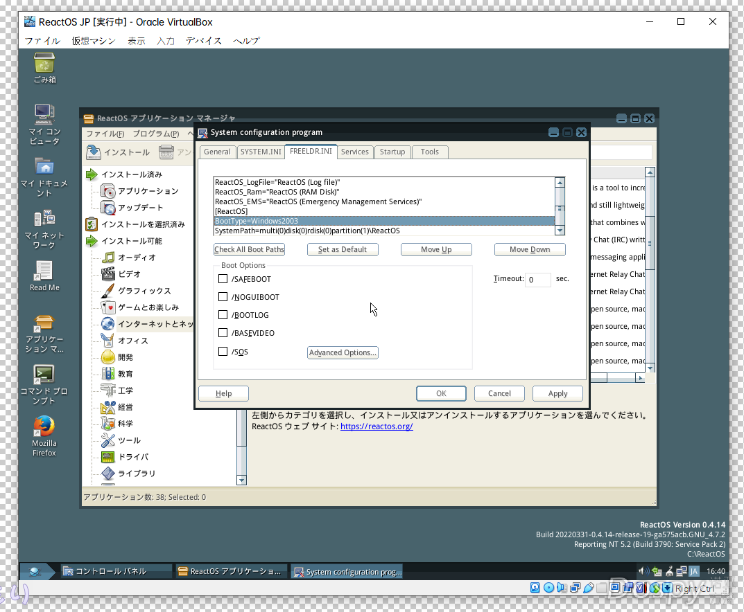 在引导控制方面,ReactOS 显示其启动类型为 Windows 2003(FREELDR)。