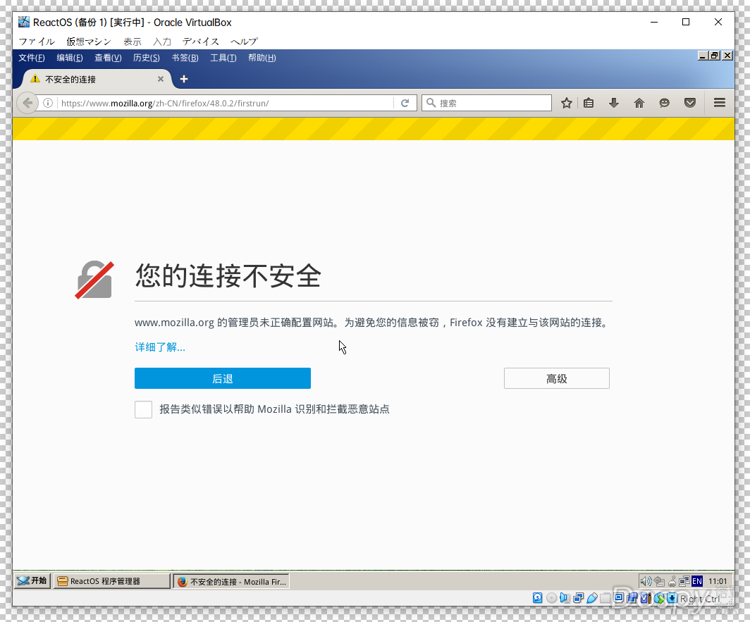 ReactOS 中的 DirectX 被命名为 ReactX,这一命名方式主要是为了避免版权问题。ReactX 的存在使得 ReactOS 能够支持一些基本的图形和多媒体功能。然而,在 ReactX 的诊断中,发现不能开始 Direct3D 测试,这表明 ReactX 在图形加速和 3D 渲染方面还存在一定的不足。这对于一些对图形性能要求较高的用户来说,可能会是一个较大的限制。不过,对于普通的 2D 图形显示和基本的视频播放,ReactX 还是能够较好地完成任务的。 ReactOS 拥有自己内置的软件管理器,这为用户提供了方便的软件安装和管理途径。通过软件管理器,用户可以浏览和安装一些常用软件。然而,目前软件管理器中的软件资源相对有限,部分软件可能无法正常下载或安装(一些使用的是 WebArchive,或是 Github),这在一定程度上限制了软件选择范围。 在驱动支持方面,ReactOS 目前只提供了少量的驱动支持。这意味着多数硬件设备无法在 ReactOS 上正常工作。 根据部分报道说,ReactOS 貌似无法在实体机运行,恐怕也是因为这个原因。毕竟驱动及其复杂,就像 Phoenix 一样,不用任何 UAC 就能让电脑蓝屏。 此外,ReactOS 的任务管理器是默认最小化到托盘的。不太理解。 (由于神秘的原因,Firefox 在我这次新安装无法启动。这里换成了之前安装的中文版) ReactOS 内置的 CA 证书由于版本过旧,导致在连接网络时会出现“连接不安全”的报错。我测试时使用的是 2022 的编译版,不知道新的编译有没有修复。 但 Firefox 52 ESR 还是可以用的。虽然落后的版本太多,但比较简单的页面也是可以看的。不过,这里因为 CA 问题,所以很多东西加载不出来。 最后