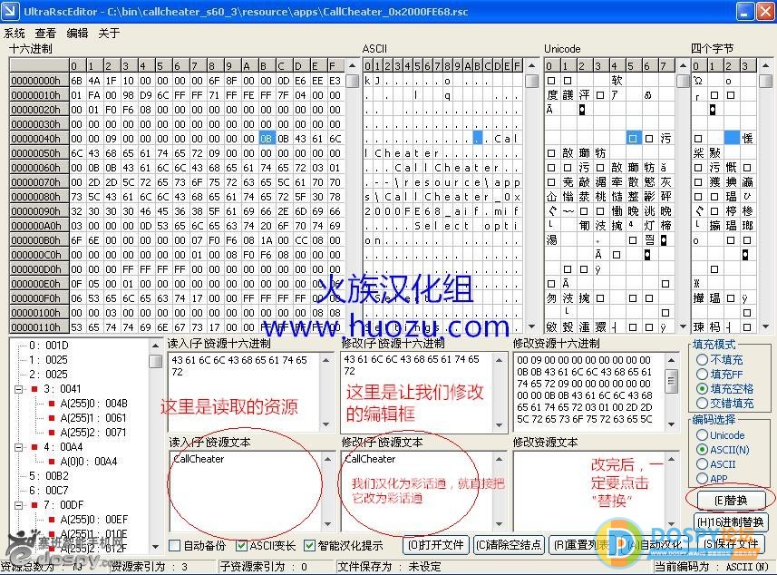 还有一个一定要分清的概念,不然下面说的可能弄不明白。就是资源结点和子资源结点的概念,子资源结点一般对应一个字符串,汉化时一般选择子资源结点,然后字符串就会显示出来,替换成中文即可。而资源结点是子资源结点的容器,资源结点中可能包括多个子资源(即字符串),他是由根据索引表构造出来的。