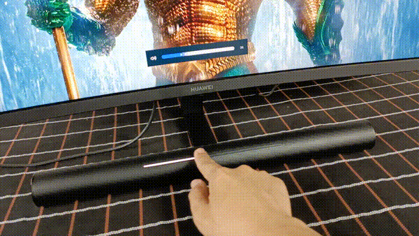千万不要以为这就完了,创新不止于此,SoundBar的炫彩RGB灯光区域,还创造性地采用了更智能、更简洁的音量控制方式——触控式音量调节,左右滑动灯光区域,就能快速地调节音效,而双击该区域则可以实现快速静音,相比传统显示器的按键操控逻辑来说,这种利用灯光和音量界面的创新式模式,可谓是有效增强了华为MateView GT的交互能力。