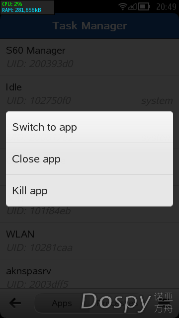 默认界面是在“app”,进去之后你可以看到当前在运行的应用。选中一个进程、应用,长按弹出来的Switch to app 指的是切换到这个软件去,close app指的是退出该软件(进程还在),Kill app指的是 杀进程强制关闭。