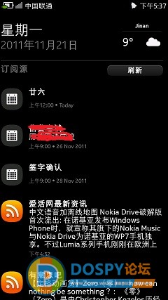 以上只是单纯把信息添加到日历当中。为了实现提醒功能,我们还可以将未来几天的日历事件显示在N9的消息主屏当中,如图:
